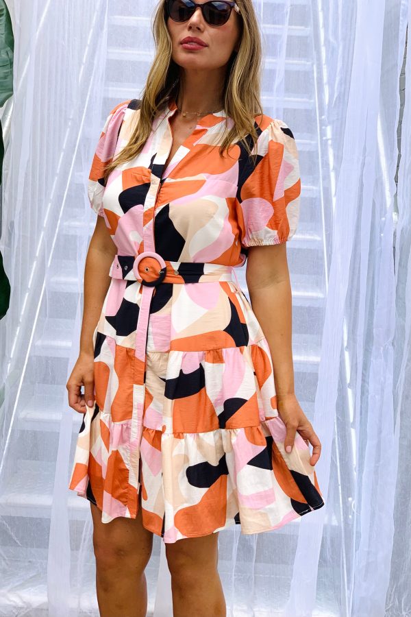 The Sportyknithoodie is a Short sleeve shirt dress style in a multi print of colours , beige, whites and orange tones, this cute short shirt style dress with tie is a perfect light weight material a dress that will be a favourite this summer. Just let the print do all the talking.