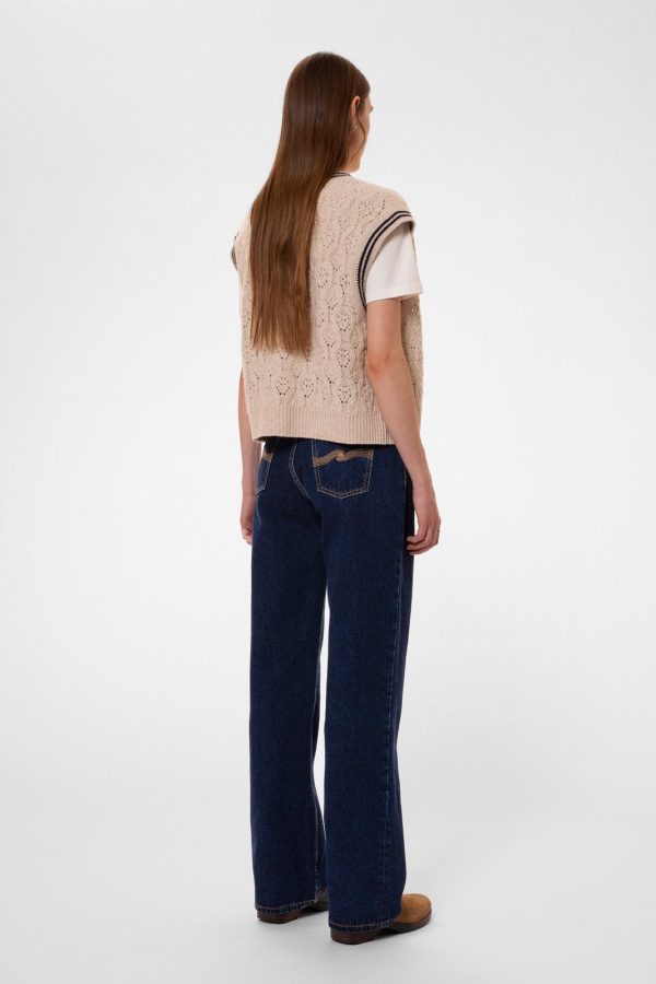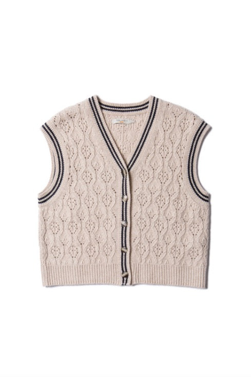 Der Halsausschnitt und die gekn pfte Vorderseite sind mit einem gestreiften 1×1-Rippstrick versehen